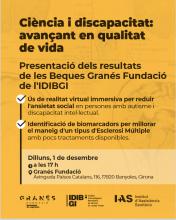 Dilluns, 1 de desembre, tindrà lloc la jornada sobre "Ciència i discapacitat: avançant en qualitat de vida" a Granés Fundació. En l'acte es presentaran els resultats de les Beques Granés Fundació de l'IDIBGI i que comptarà amb la presència dels investigadors i les persones implicades en les dues recerques: