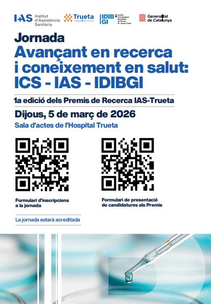 Jornada "Avançant en recerca i coneixement en salut: ICS - IAS - IDIBGI"Dimecres, 14 Gener 2026Està dirigida als professionals i tindrà lloc el dia 5 de març a la Sala d'Actes de l'Hospital Josep Trueta. També es lliuraran els premis de recerca |